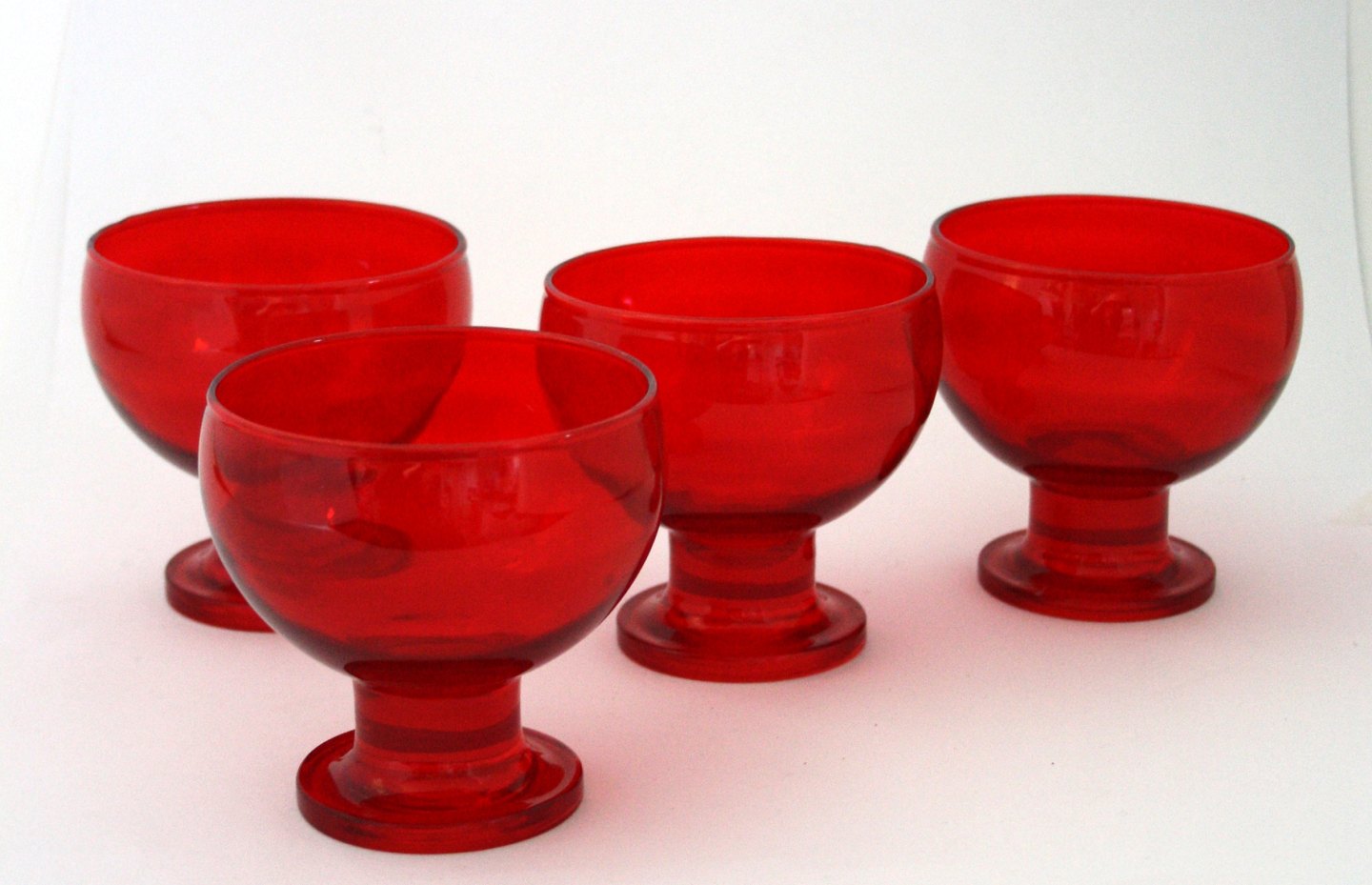 Flotte røde ballonglas med klar bund. Højde 10 cm. Øverste diameter 10 cm. Pris: 4 stk. 800 kr. sælges samlet.