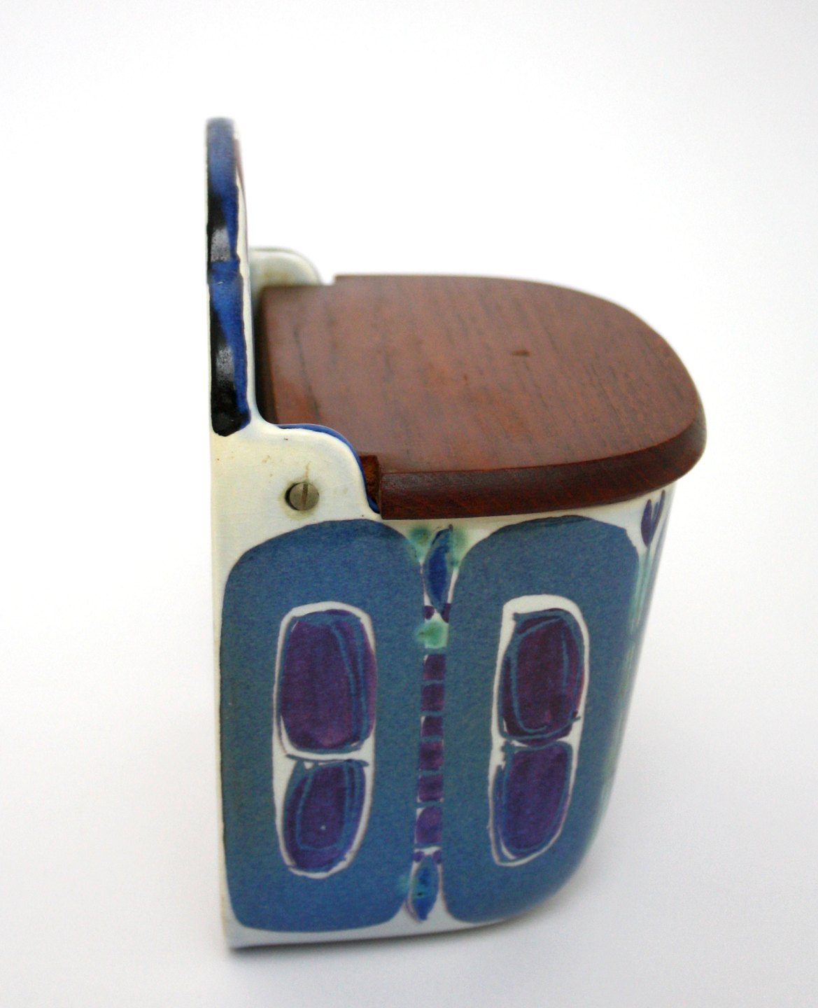 Aluminia, Tenera, Saltkar med teaktrælåg. Designet af Inge-Lise Koefoed i 1961. Nr. 180/261. Højde 16 cm. Længde 15 cm. Dybde 10 cm. Flot stand med lettere overfladekrakelering. Pris: 425 kr.