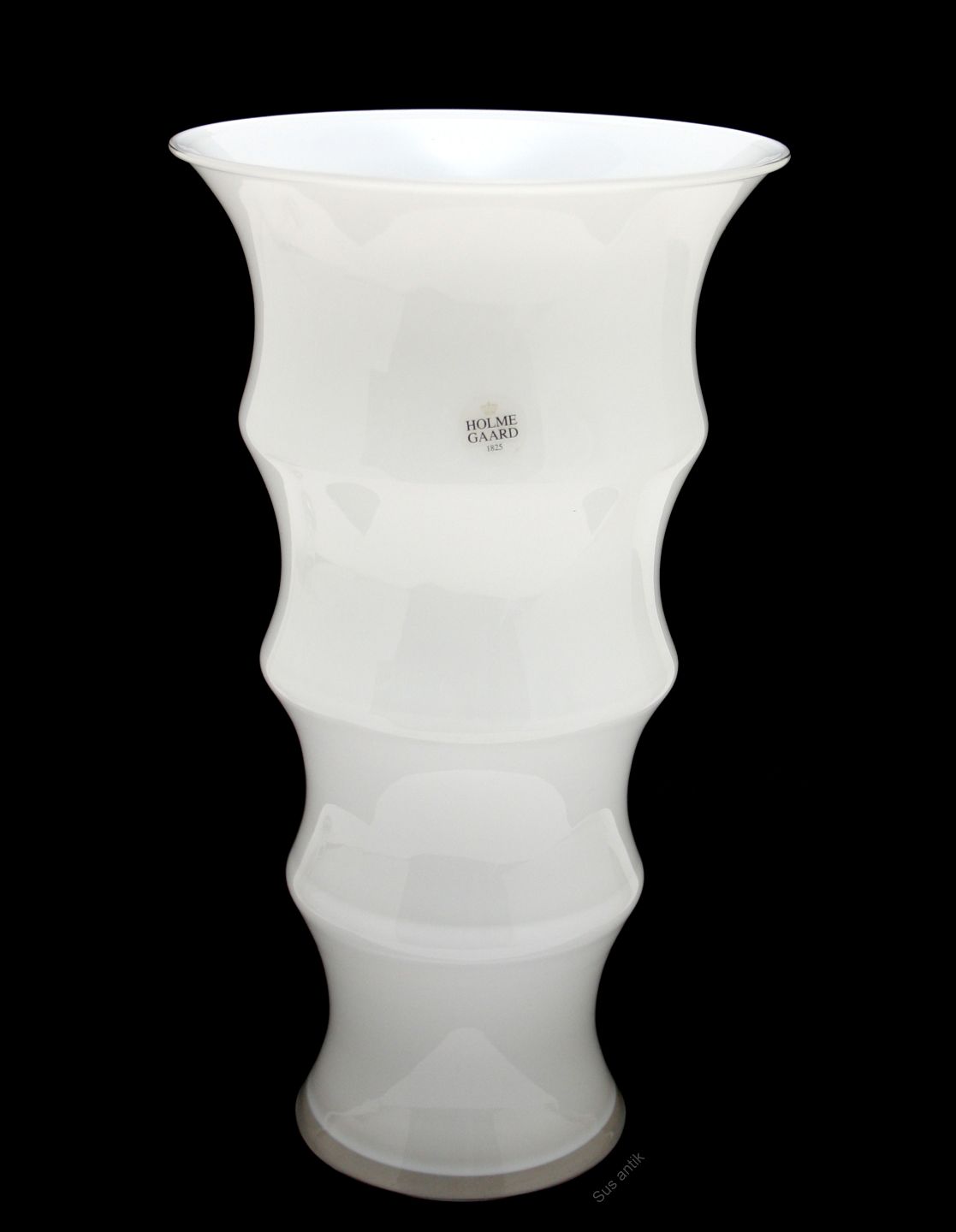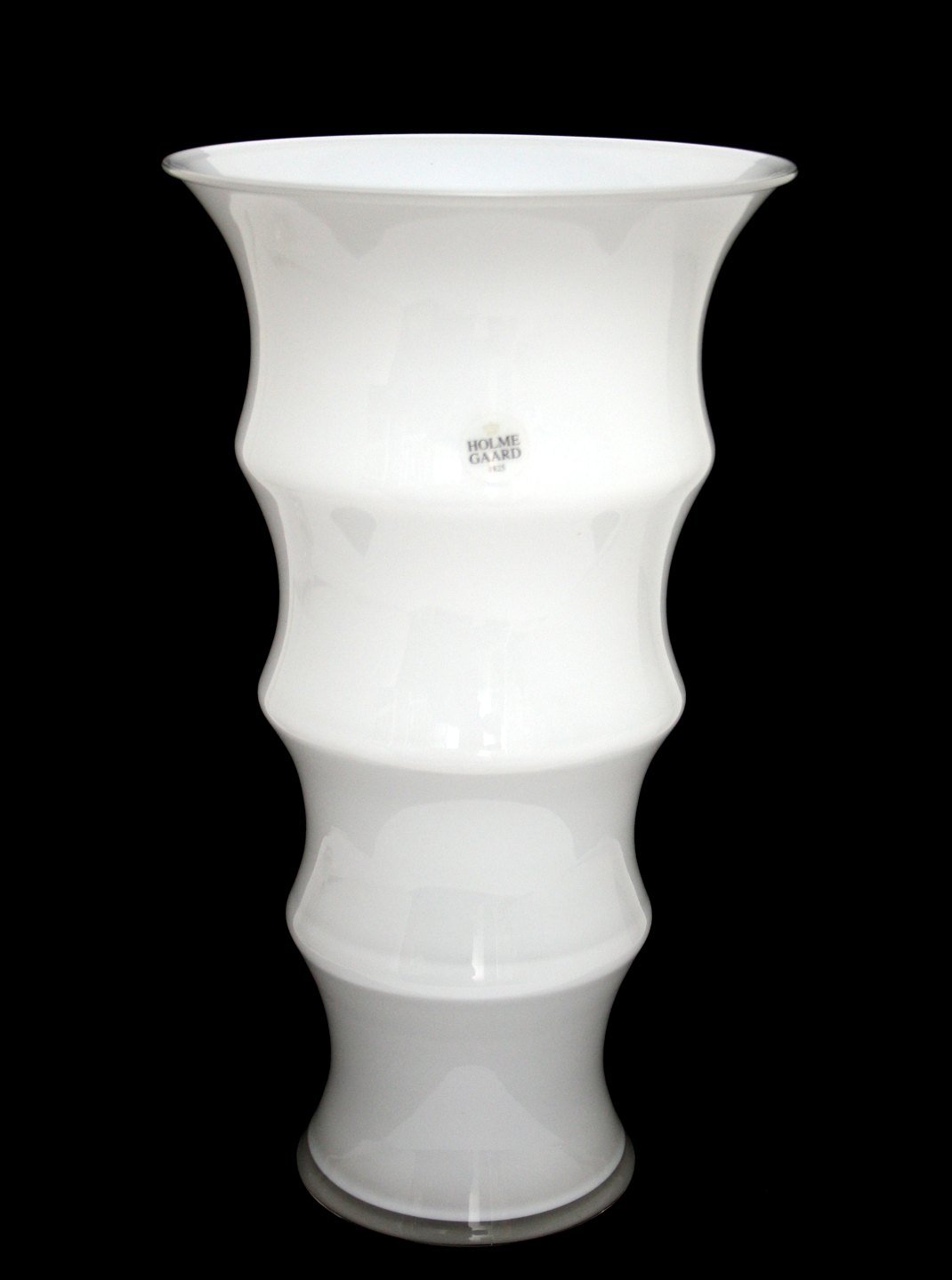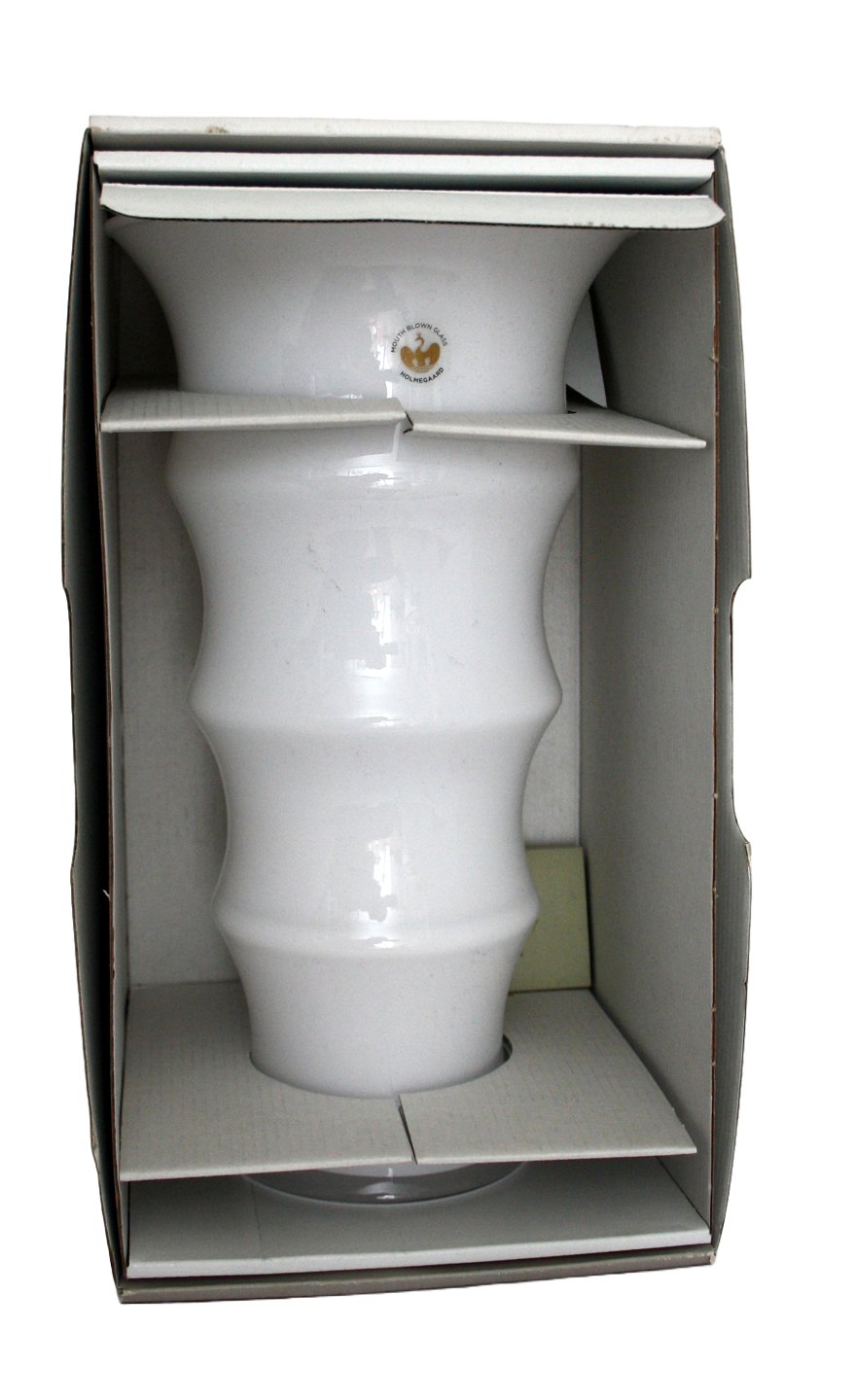 Holmegaard, Karen Blixen opalinehvid vase stor størrelse. Designet af Anja Kjær i 2000. Vasens form er inspireret af afrikanske kvinders hals og armringe. Højde 31 cm. Diameter 17,5 cm. Ny og ubrugt stand i originalæske, se sidste foto. Pris: SOLGT