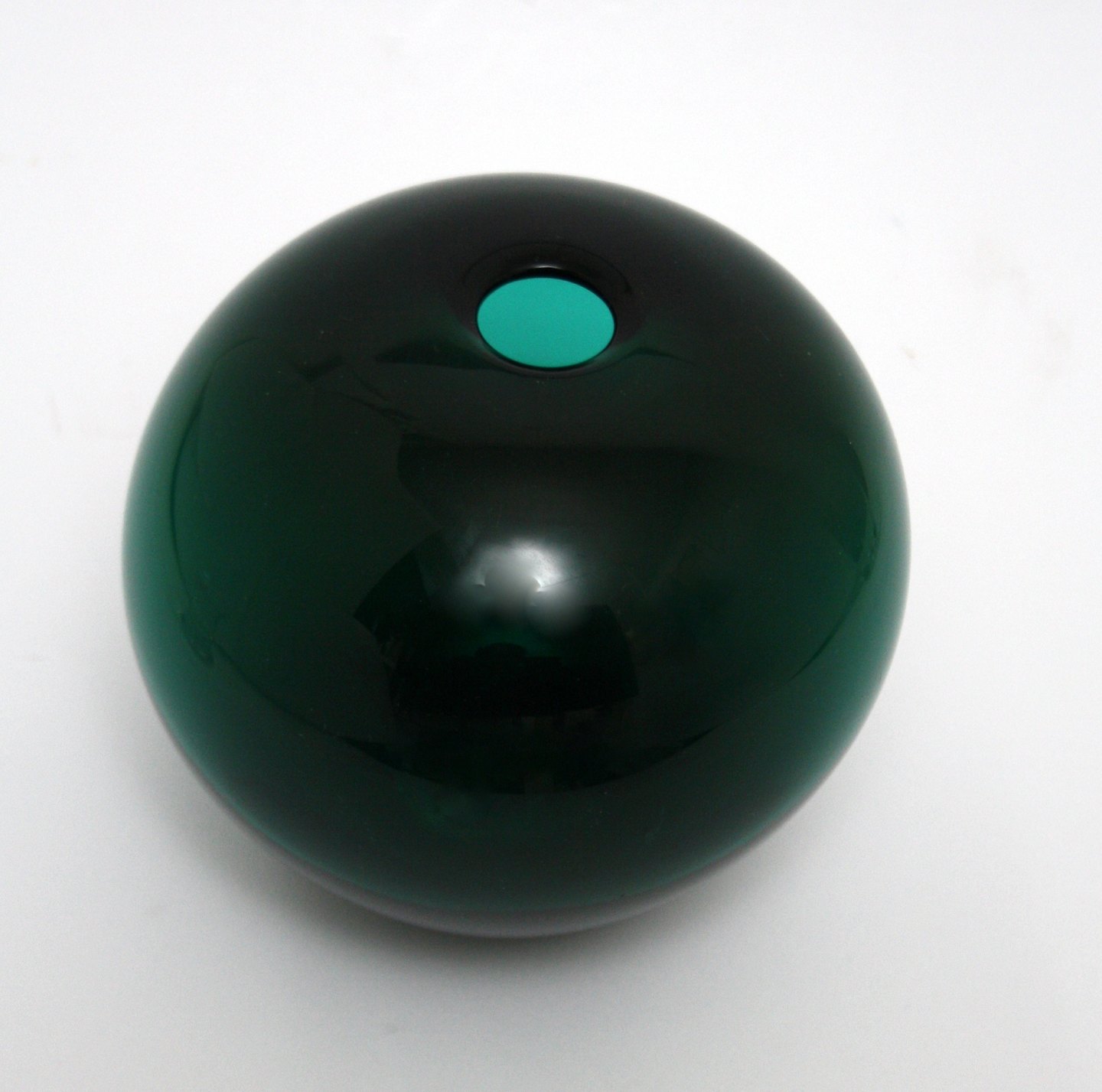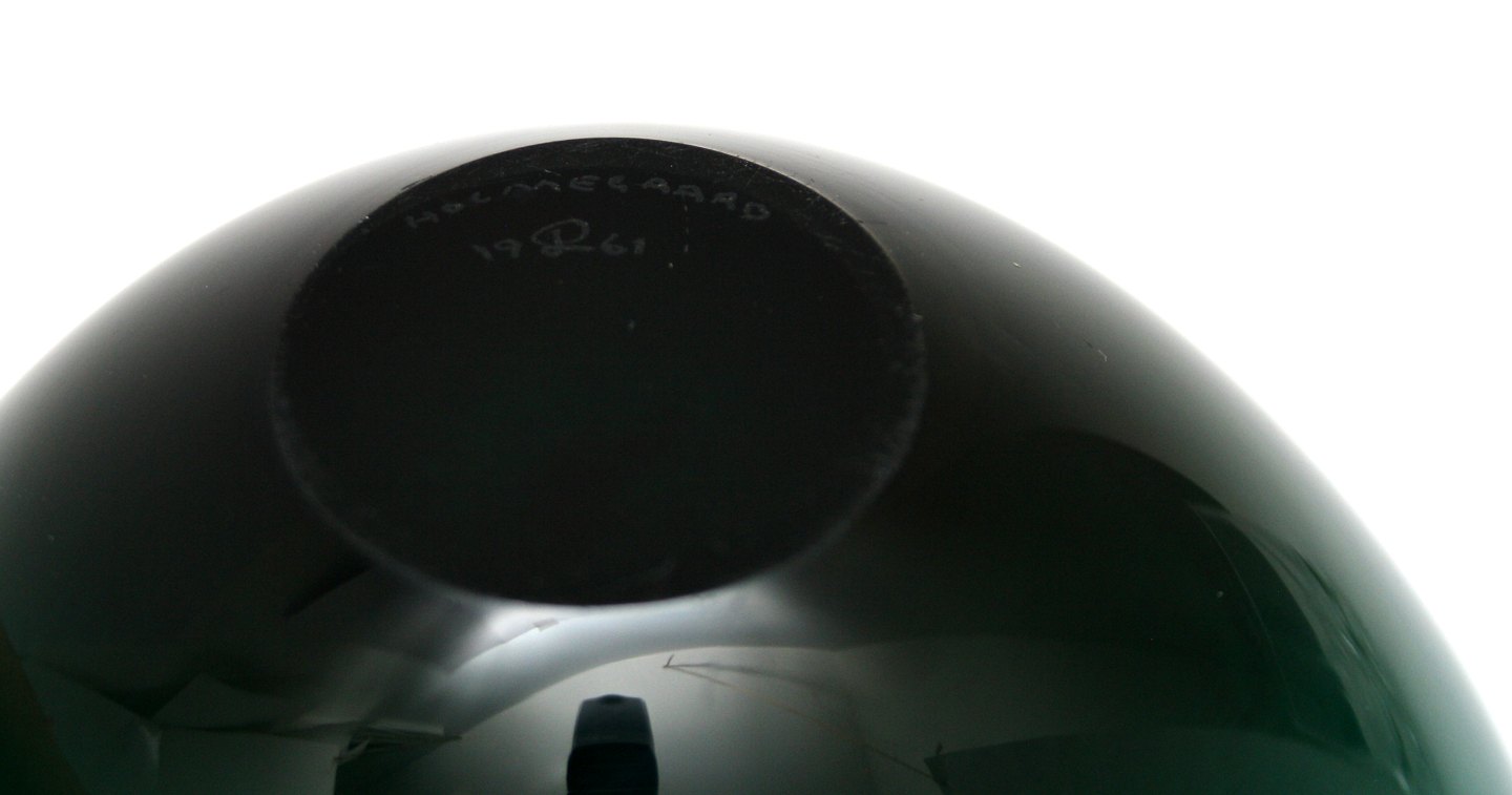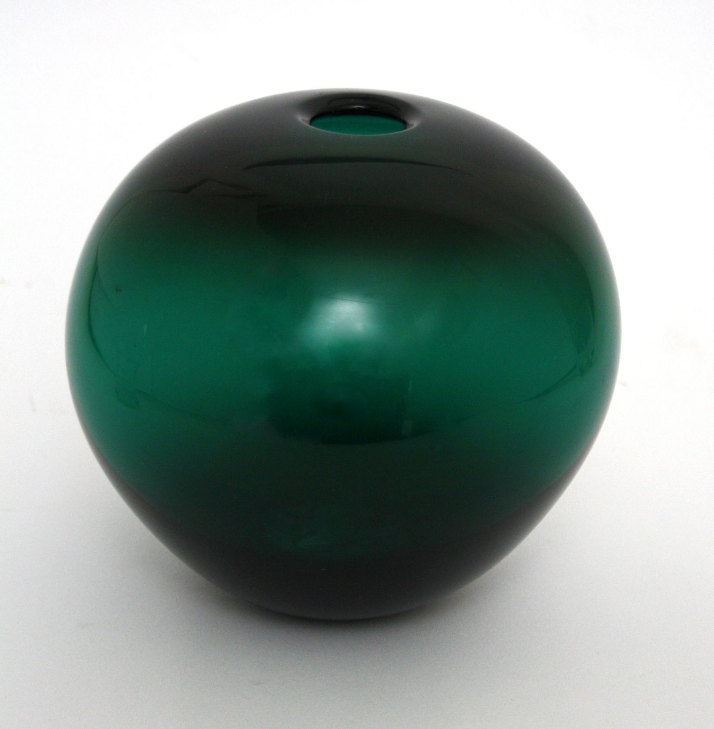 Holmegaard, Kuglevase i ædelgrønt glas, mundblæst teknik hvor glasmassen formes ved hjælp af en pind. Designet af Per Lütken 1961. Signeret Holmegaard, PL 1961. Højde 13 cm. Diameter 13 cm. Sjælden. Flot stand. Pris: SOLGT
