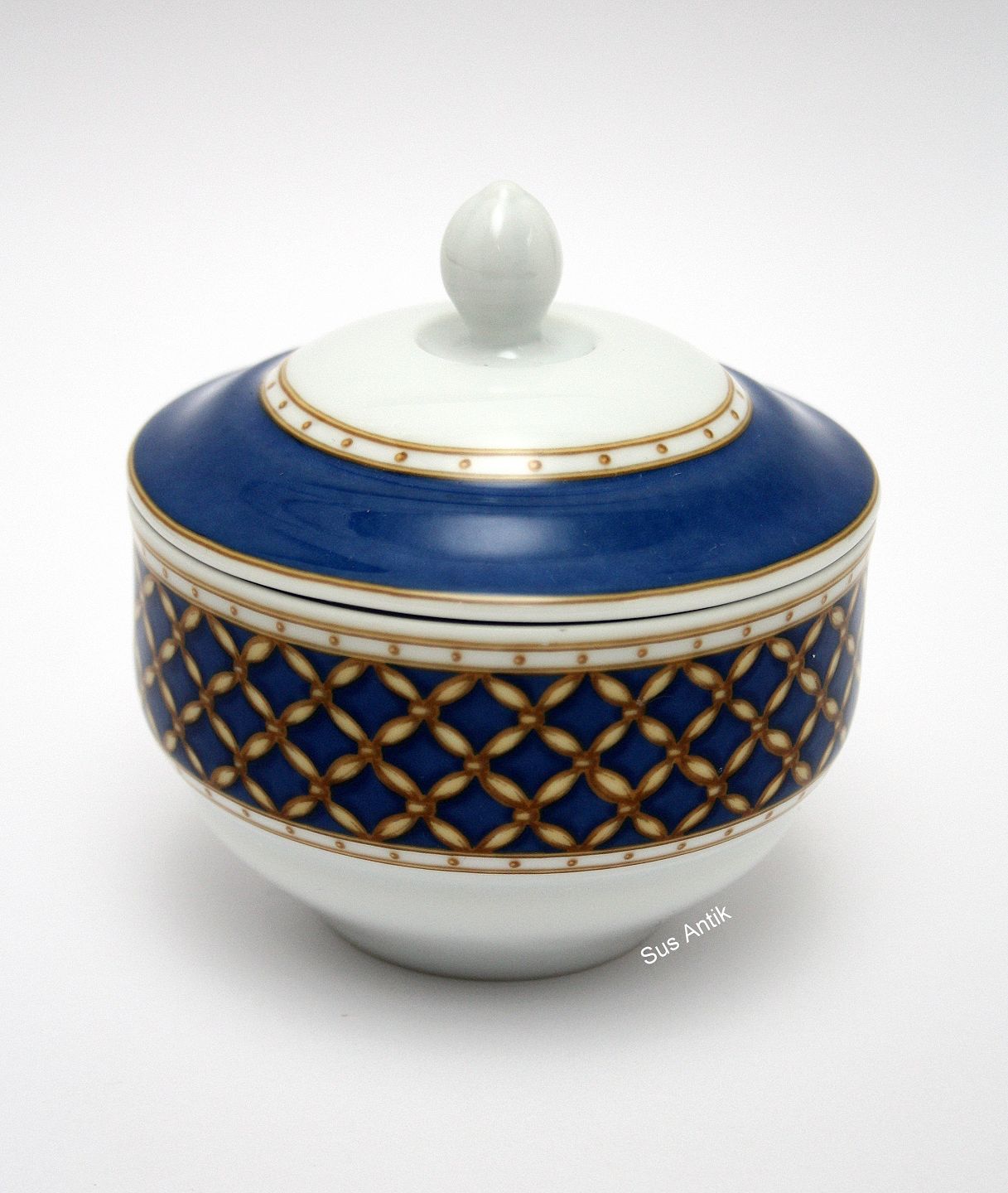 Royal Copenhagen, Ny Liselund. Sukkerskål nr. 161, låg nr. 160. Designet af Diana Holstein i 2001. Mørkeblå med guldkant. Højde 10 cm. Diameter 10 cm. I. sortering. Pris: 275 stk. Lager: 1