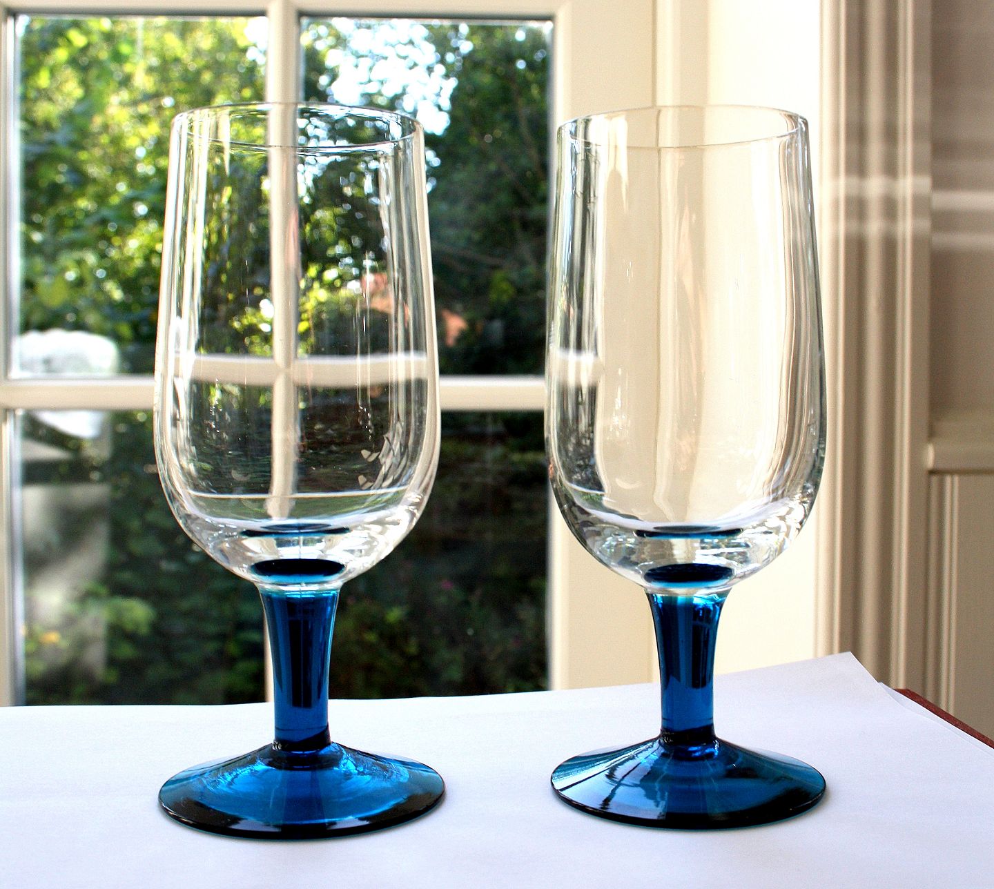 Ølglas med blå stilk. Antageligt fra Kastrup glasværk i 1950'erne, stilken har samme blå farve som de Hollandske snapseglas fra Kastrup og er formentlig brugt sammen med disse. Højde 16 cm. Øverste diameter 6 cm. Pris: 75 kr. stk. Lager: 12+