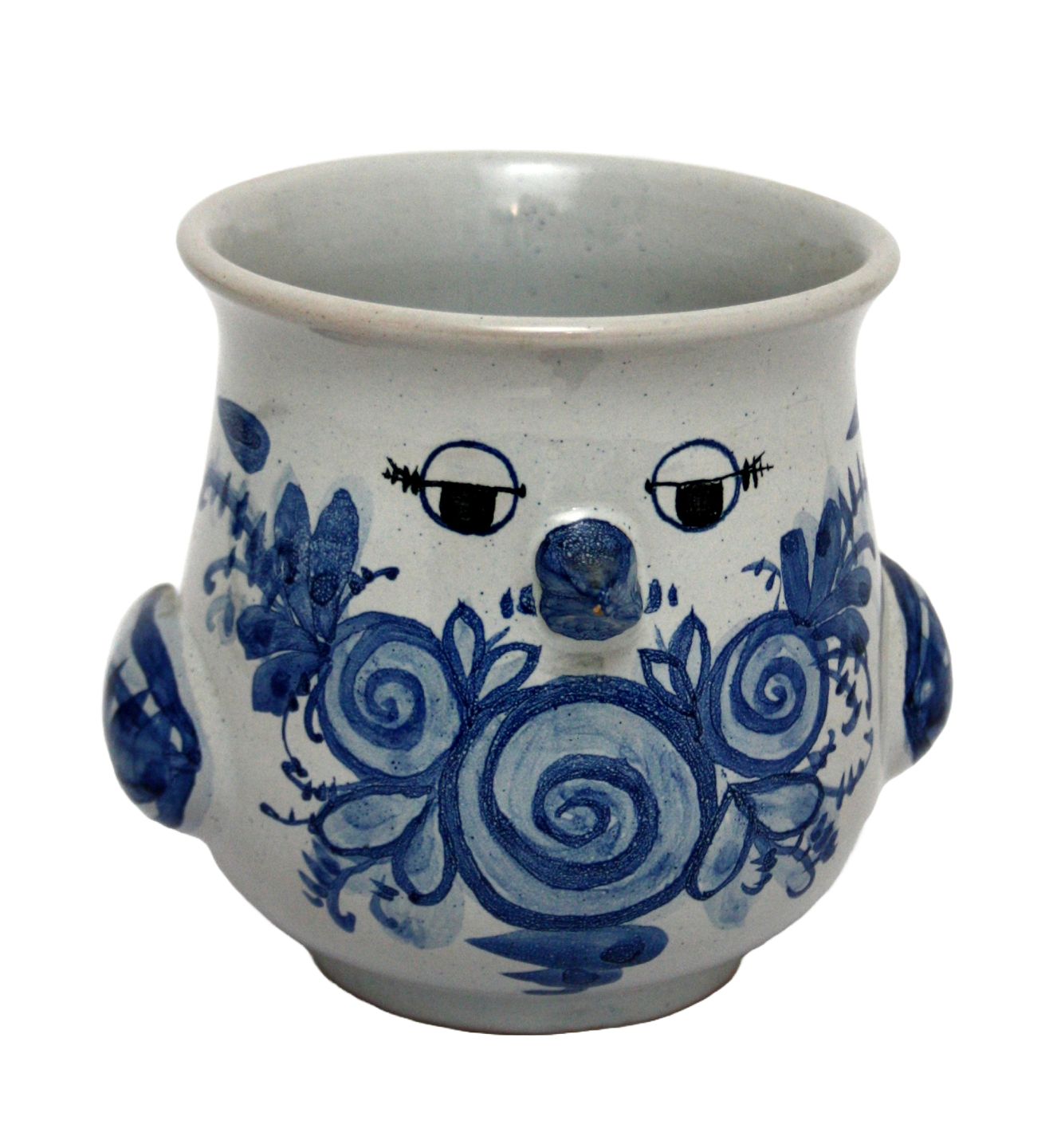 Bjørn Wiinblad, Lille urtepotte med fuglemotiv i blå farver. Nr. V66 1976. Højde 10 cm. Diameter 9,5 cm. Minimale chip glasurafslag under næb og den ene vinge. Pæn stand. Pris: SOLGT