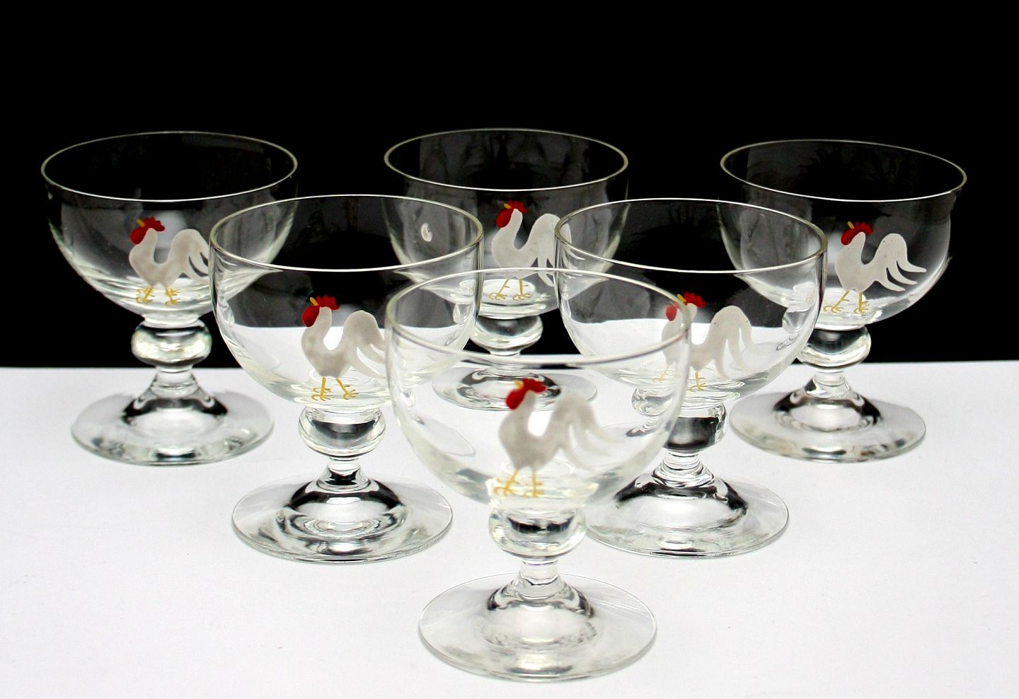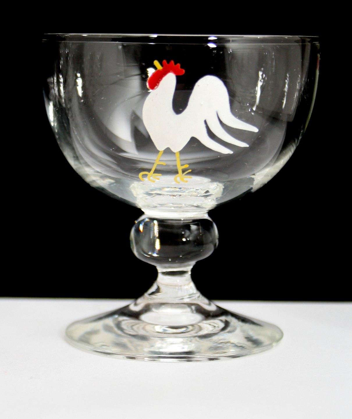 Holmegaard Glasværk, Cocktail glas med emaljebemalet hvid hane. Designet af Jacob E. Bang og fremstillet på Malerstuen i Nyhavn 12 i perioden 1937-1957. Cocktailglas/Likørglas. Højde 7,5 cm. Diameter 7 cm. Pris: SOLGT