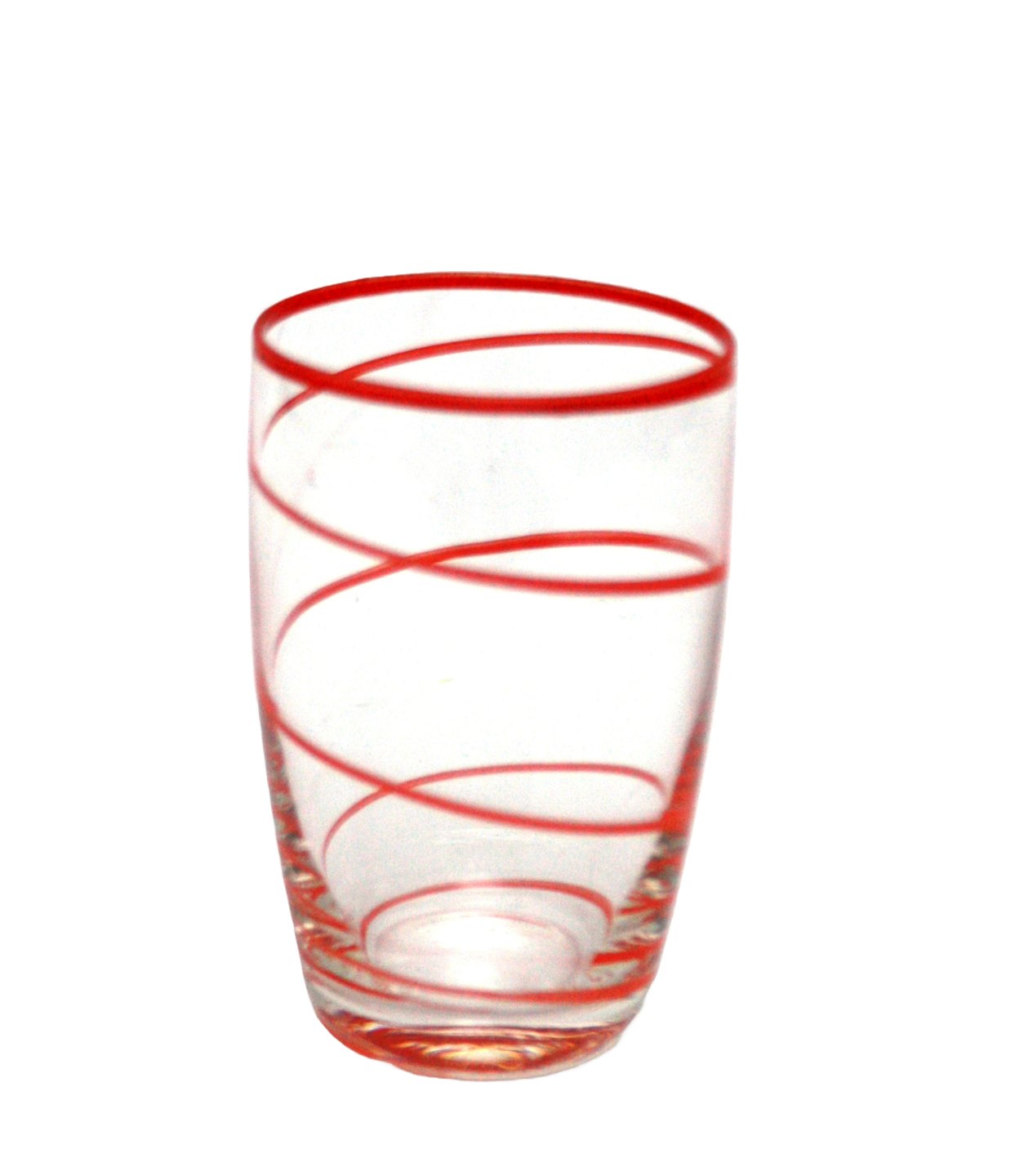Holmegaard glasværk, Drikkeglas/vandglas/sodavandglas med spiral og kant i emaljefarver. Nr. 8897-9077. Designet af Jacob E. Bang i 1937 og udgået i 1957. Højde 9 cm. Diameter 5,8 cm. Pris: 100 kr. stk.