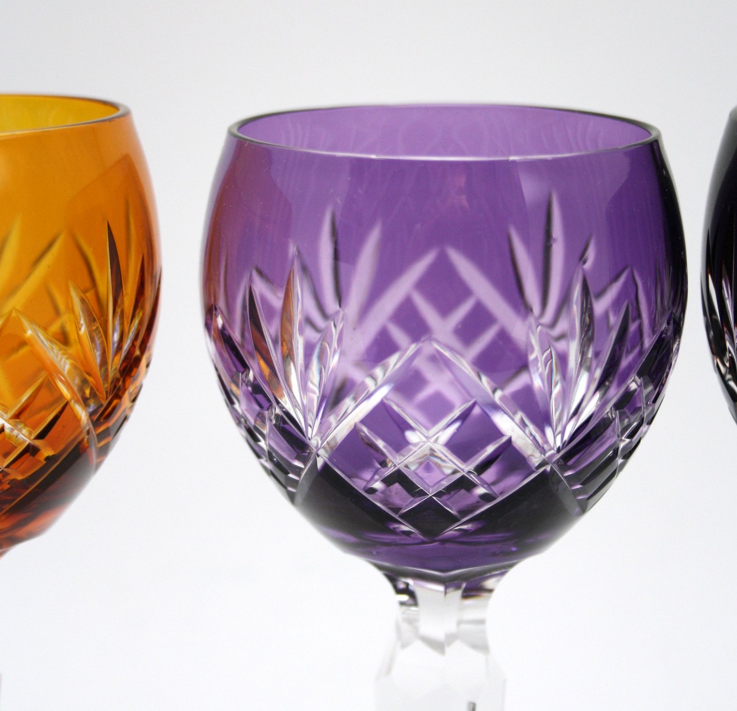 Bøhmisk krystalglas med slibninger på kumme og stilk. Lilla, Grøn, Bordeaux og Gylden. Højde 18,5 cm. Øverste diameter 6,5 cm. Pris for sæt på 4 glas: SOLGT