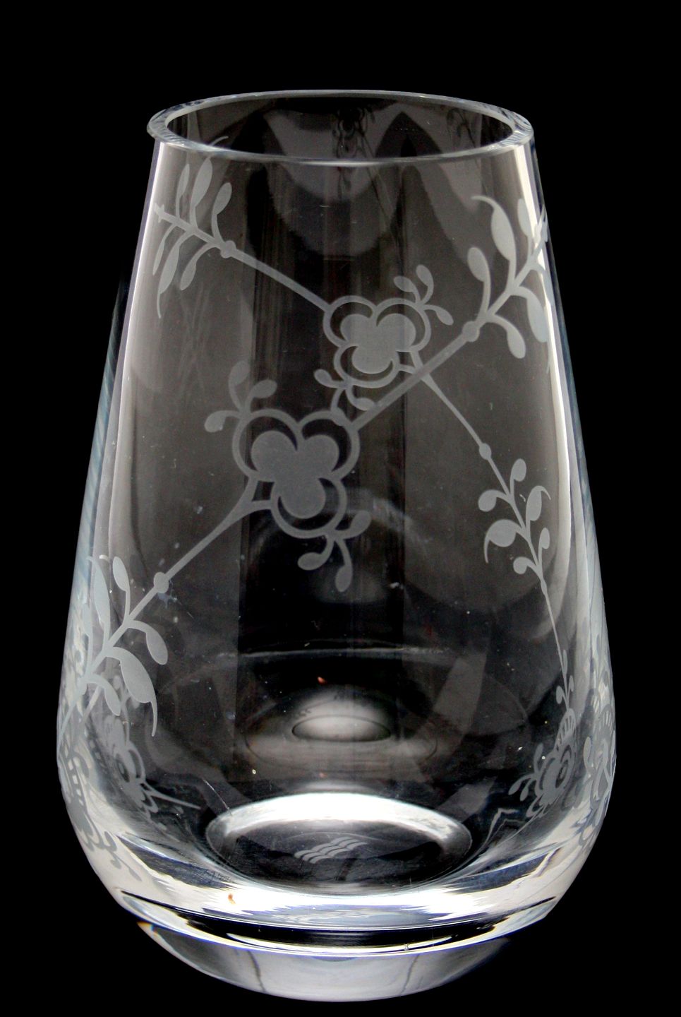 Royal Copenhagen, Glasvase med ætset musselmalet motiv og 3 bølger i bund. Nr. 482. Produceret i 2008. Højde 17,5. Øverste diameter 7,5 cm. En ridse i den nederste del af vasen. Pris: SOLGT