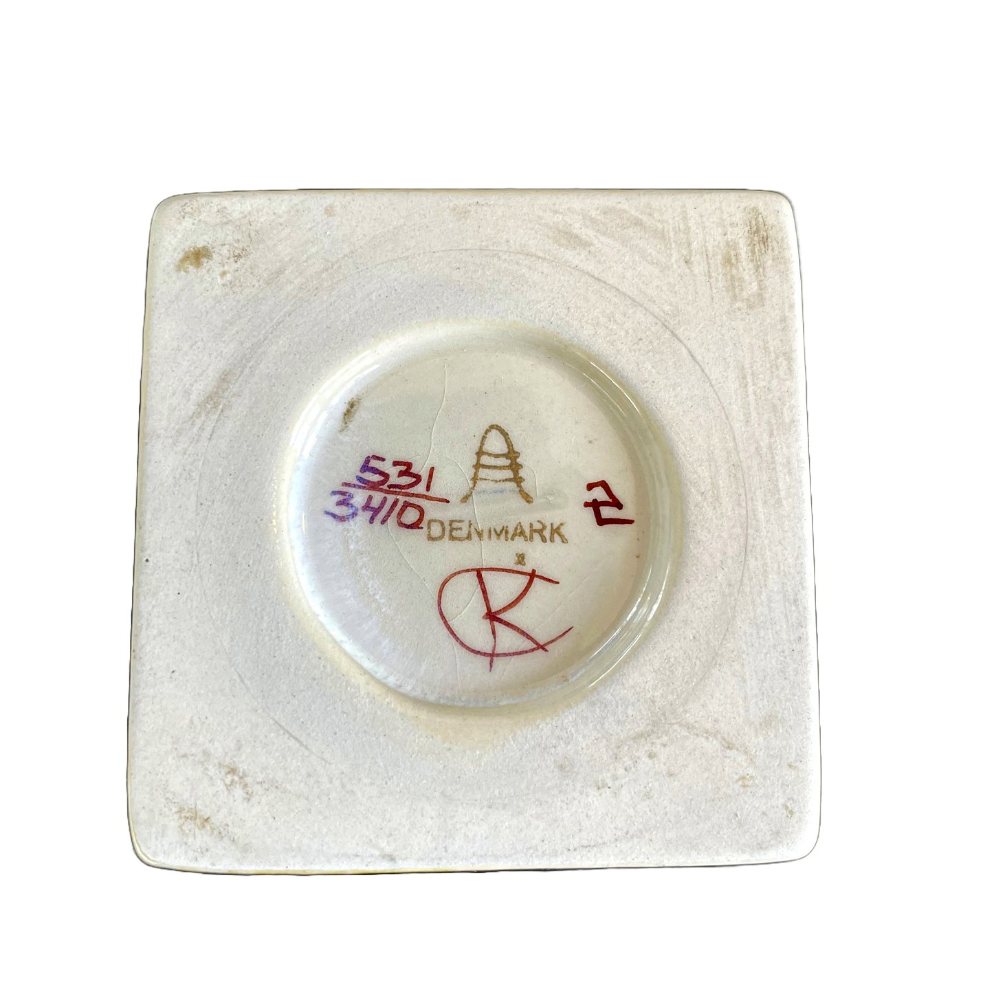 Aluminia kunstfajance, Tenera, Lysestage. Designet af Kari Christensen, Norge. Tenera blev produceret i perioden 1958-1967. Nr. 531/3410. Højde 4,2. Mål 7 x 7 cm. Lettere overfladekrakelering. Pris: 200 kr.