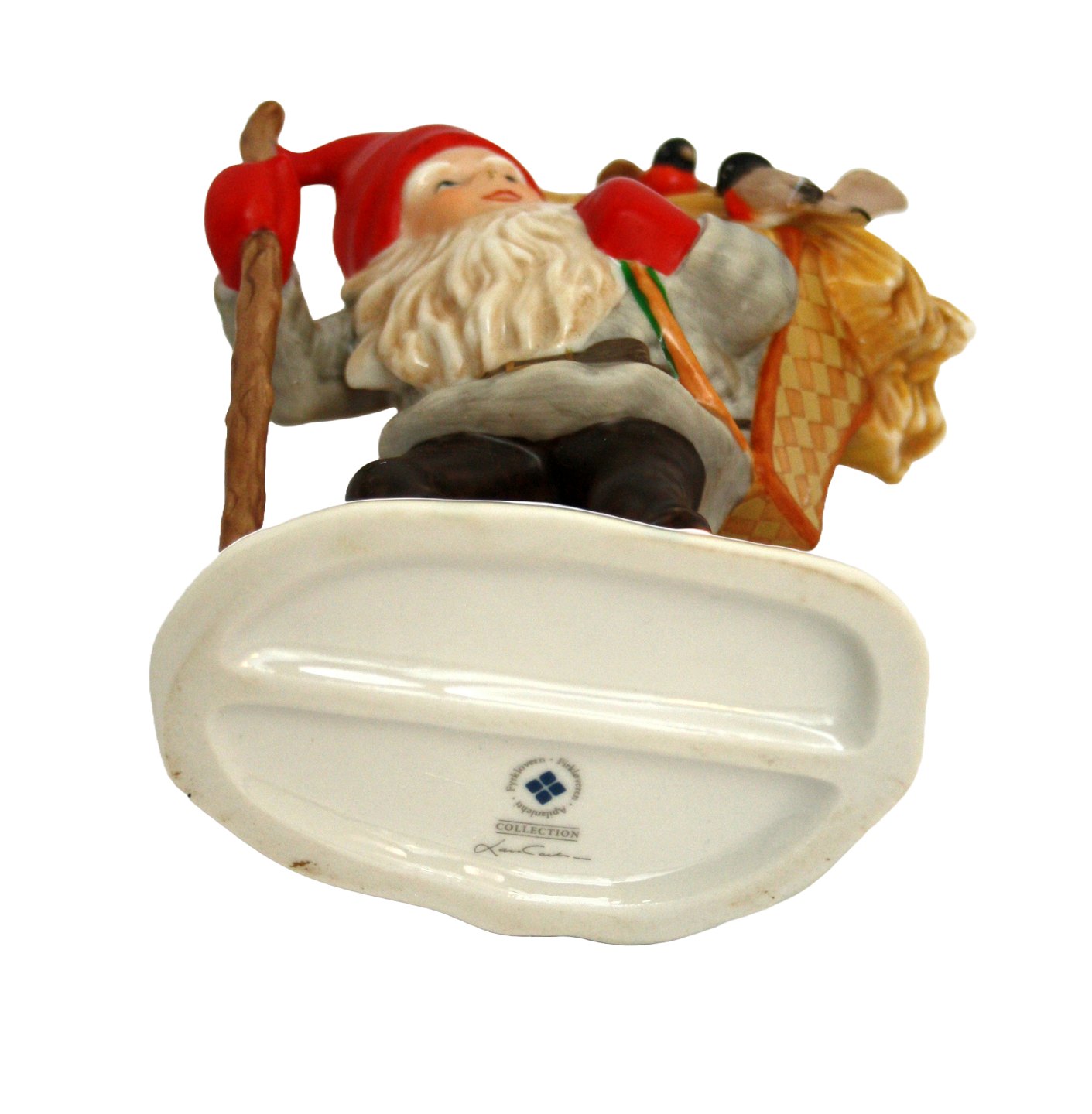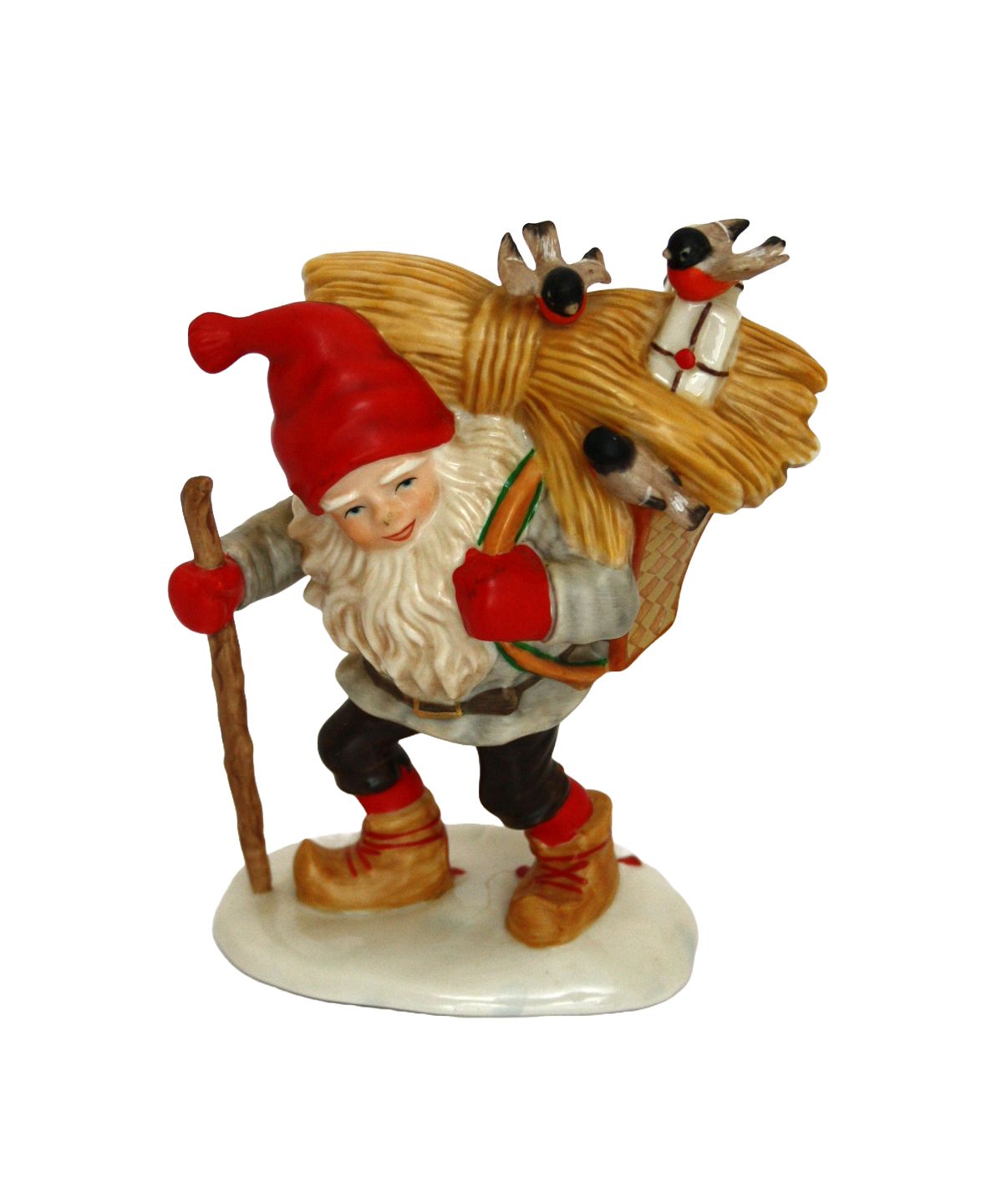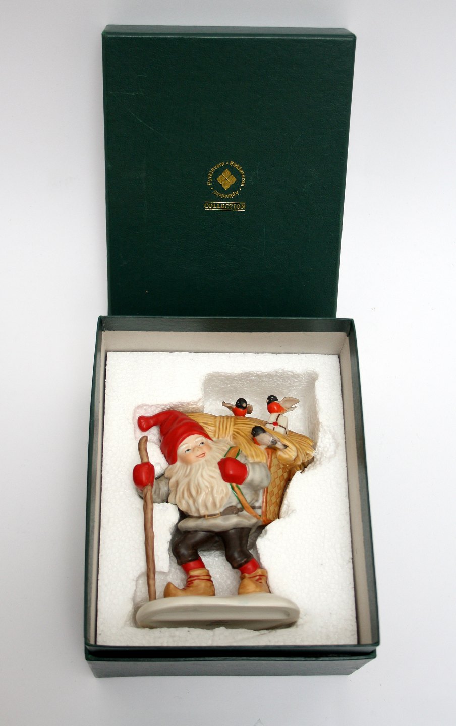 Firkløveren, Nisse der vandrer med kurv med neg og fugle. Designet af Lars Carlsson. Højde 13 cm. Flot stand. Originalæske medfølger. Pris: SOLGT