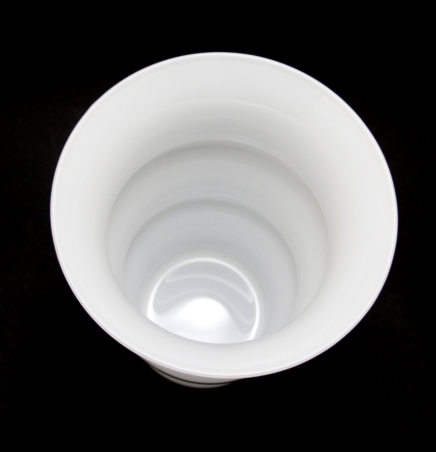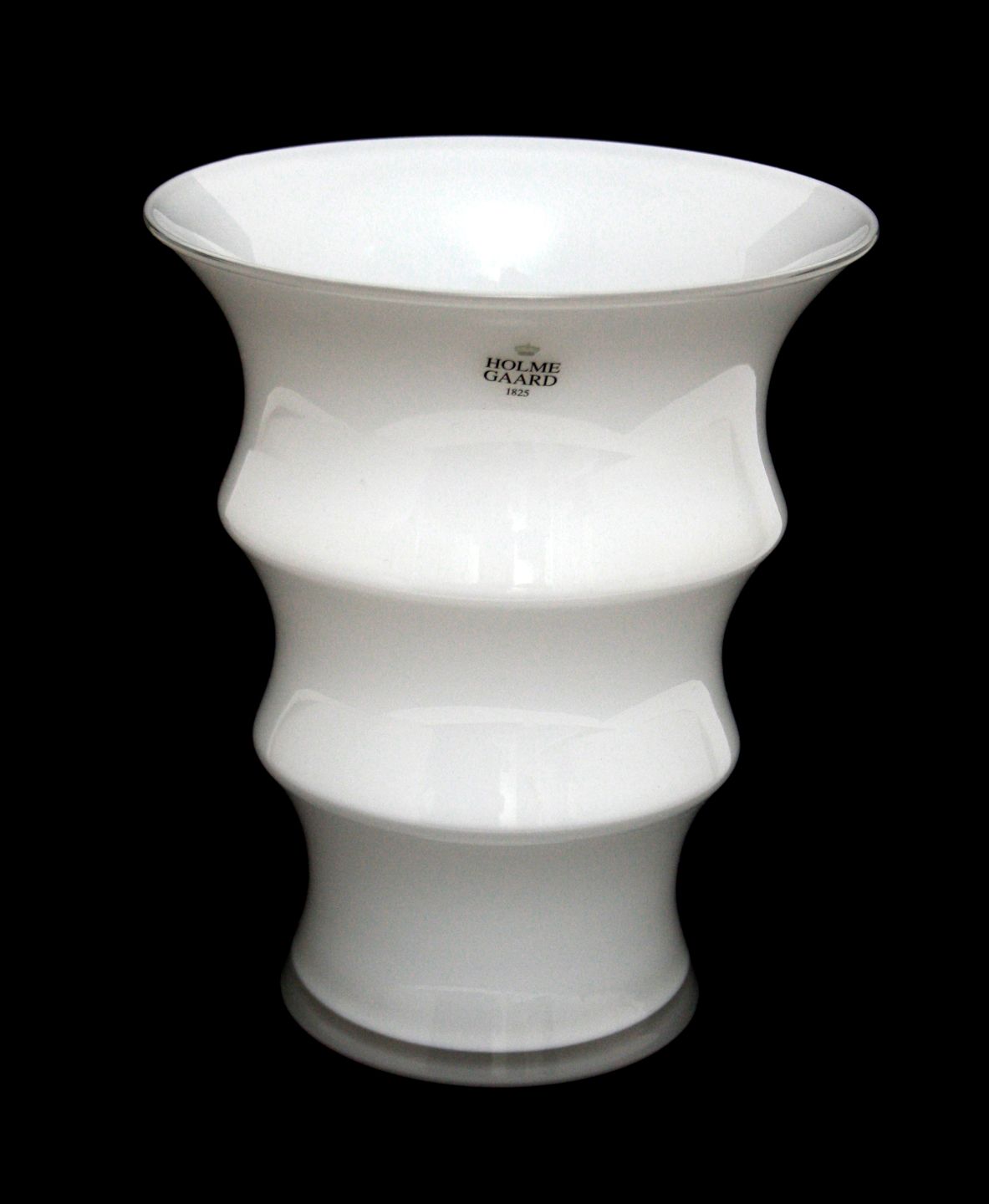 Holmegaard, Karen Blixen opalinehvid vase, designet af Anja Kjær i 2000. Vasens form er inspireret af afrikanske kvinders hals og armringe. Højde 17 cm. Diameter 14 cm. Pris: SOLGT