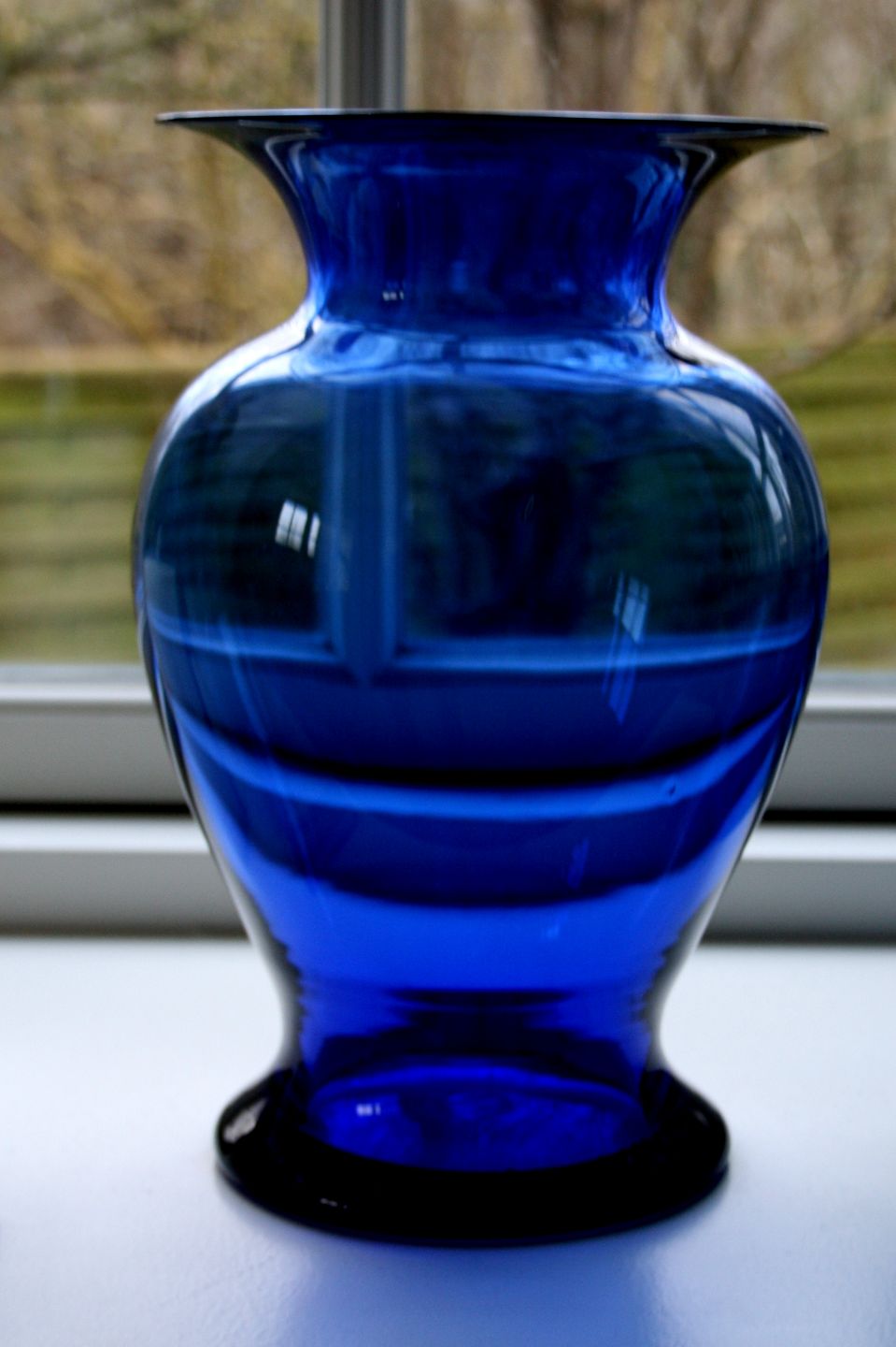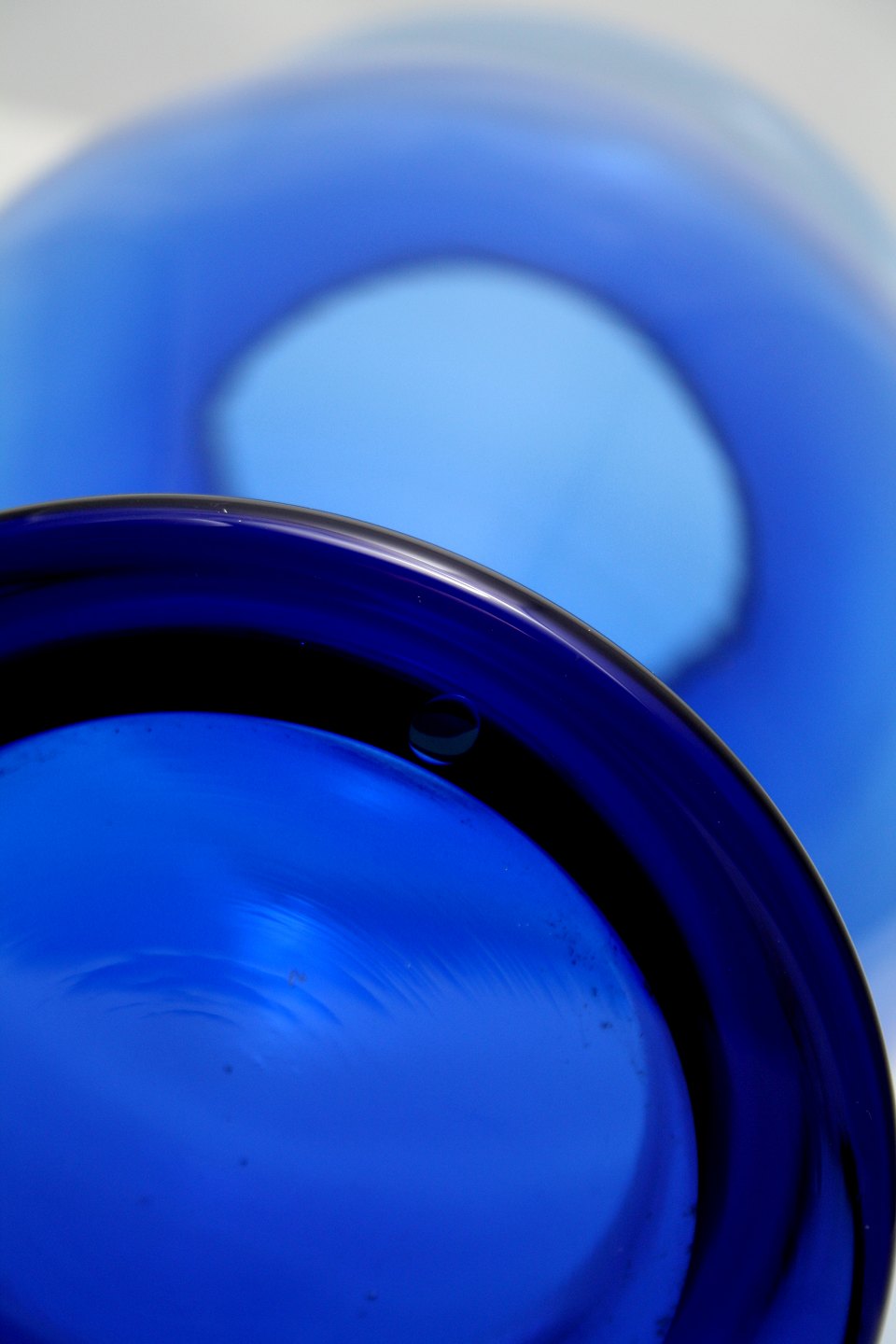 Holmegaard, Amfora, Vase i koboltblå gennemsigtig glas. Designet af Michael Bang i 1991. Højde 26,5 cm. Øverste diameter 17 cm. II. sortering er mærket med 2 tal. Lille luftboble på midten, samt luftblære i bund. Pris: SOLGT