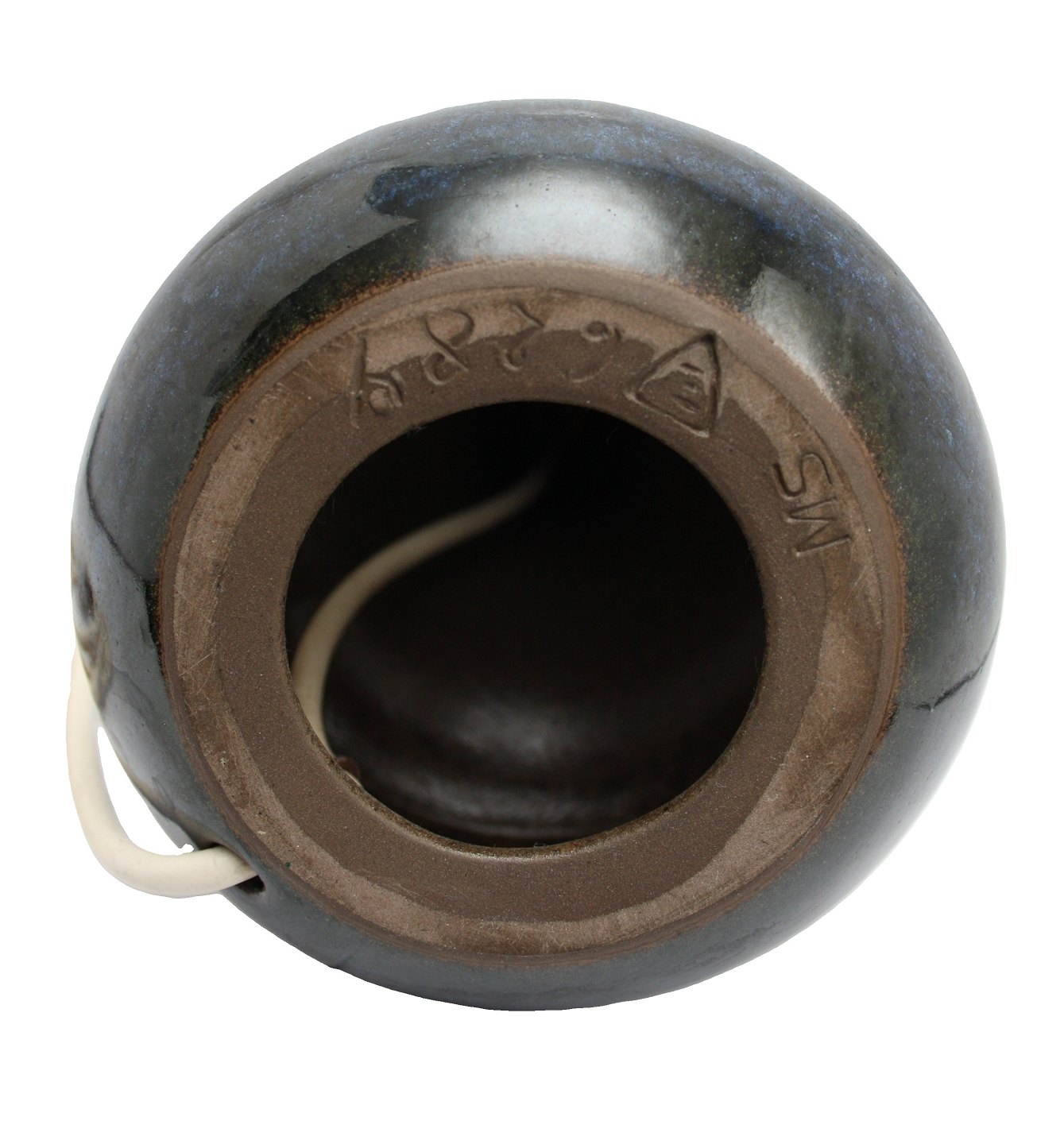 Michael Andersen, Bornholm. Stilren blåglasseret bordlampe med gennemborede huller i lampefod. Designet af Marianne Starck. Nr. 6284. Højde incl. fatning 28 cm. Diameter 13 cm. Fin stand. Pris: SOLGT