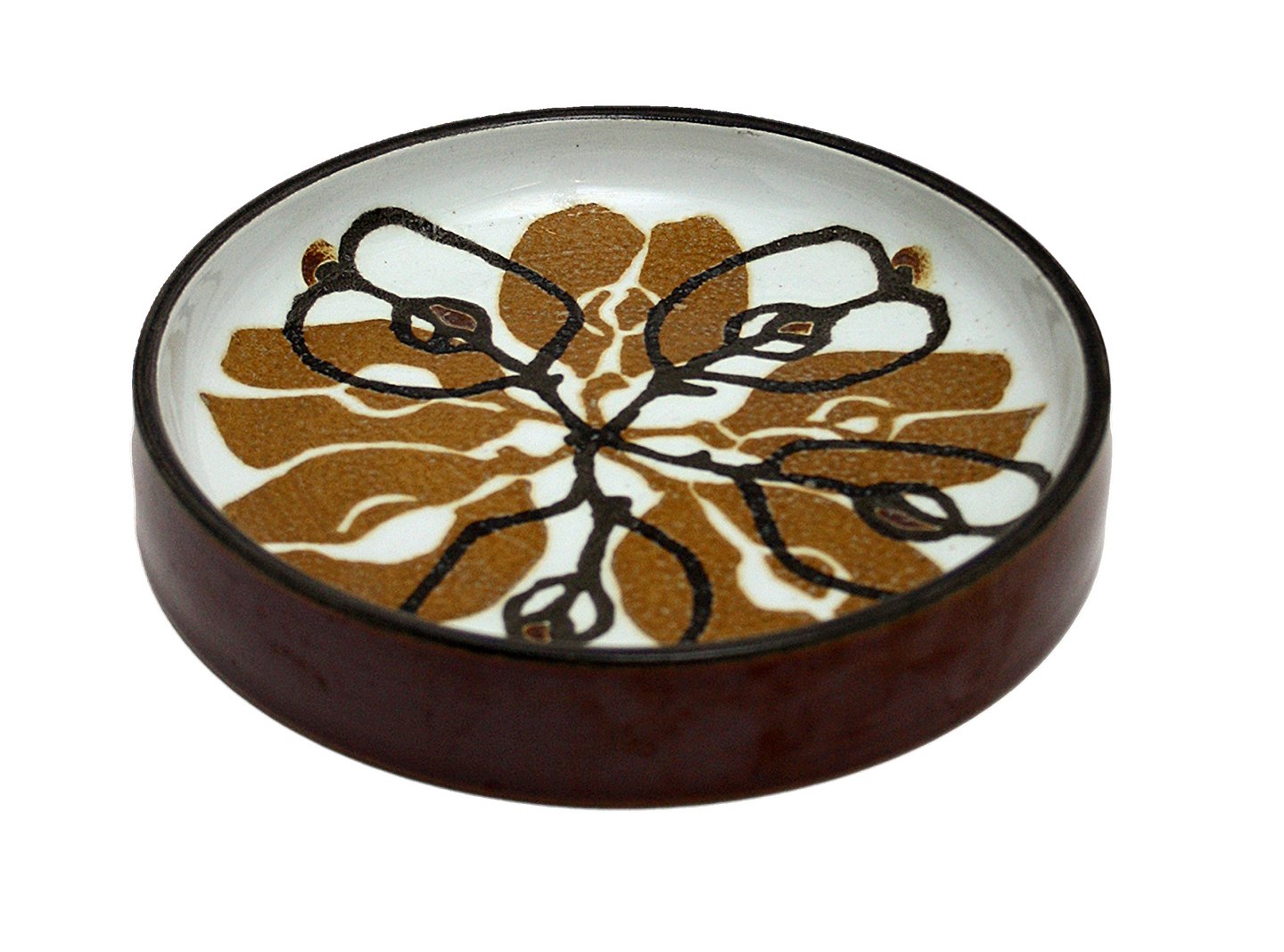 Royal Copenhagen Kunstfajance, Rundt fad med æblemotiver i sort og brun. Nr. 627/3587. Designet af Ellen Malmer. Diameter 19,5 cm. Højde 3 cm. Overfladekrakeleringer. Pris: 350 kr. stk. Lager: 1