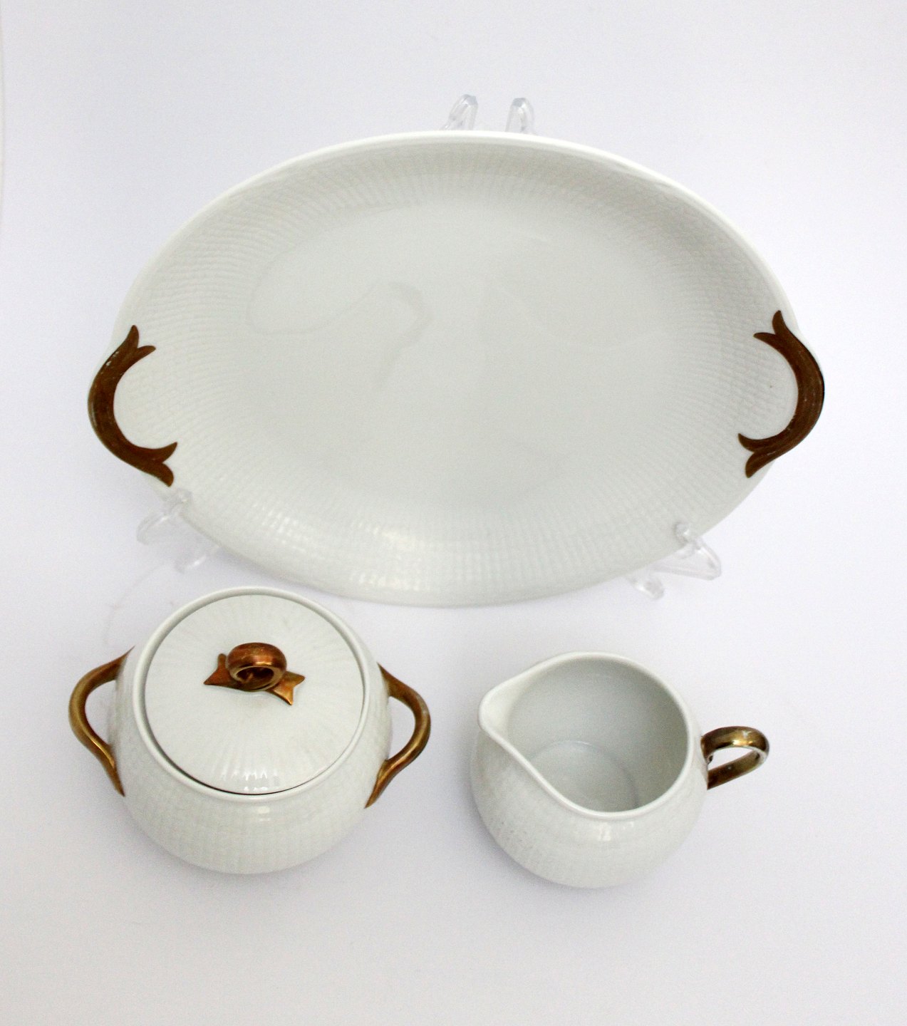 Rørstrand, Sweden, Swedish Grace med guld. Sukker og fløde, samt kagefad. Dette stel er kun guldbelagt på ører/hanke og nederste kant. Designet af Louise Adelborg (1915-1971) i 1930, som det store nationale servicestel. Grace stellet produceres endnu.