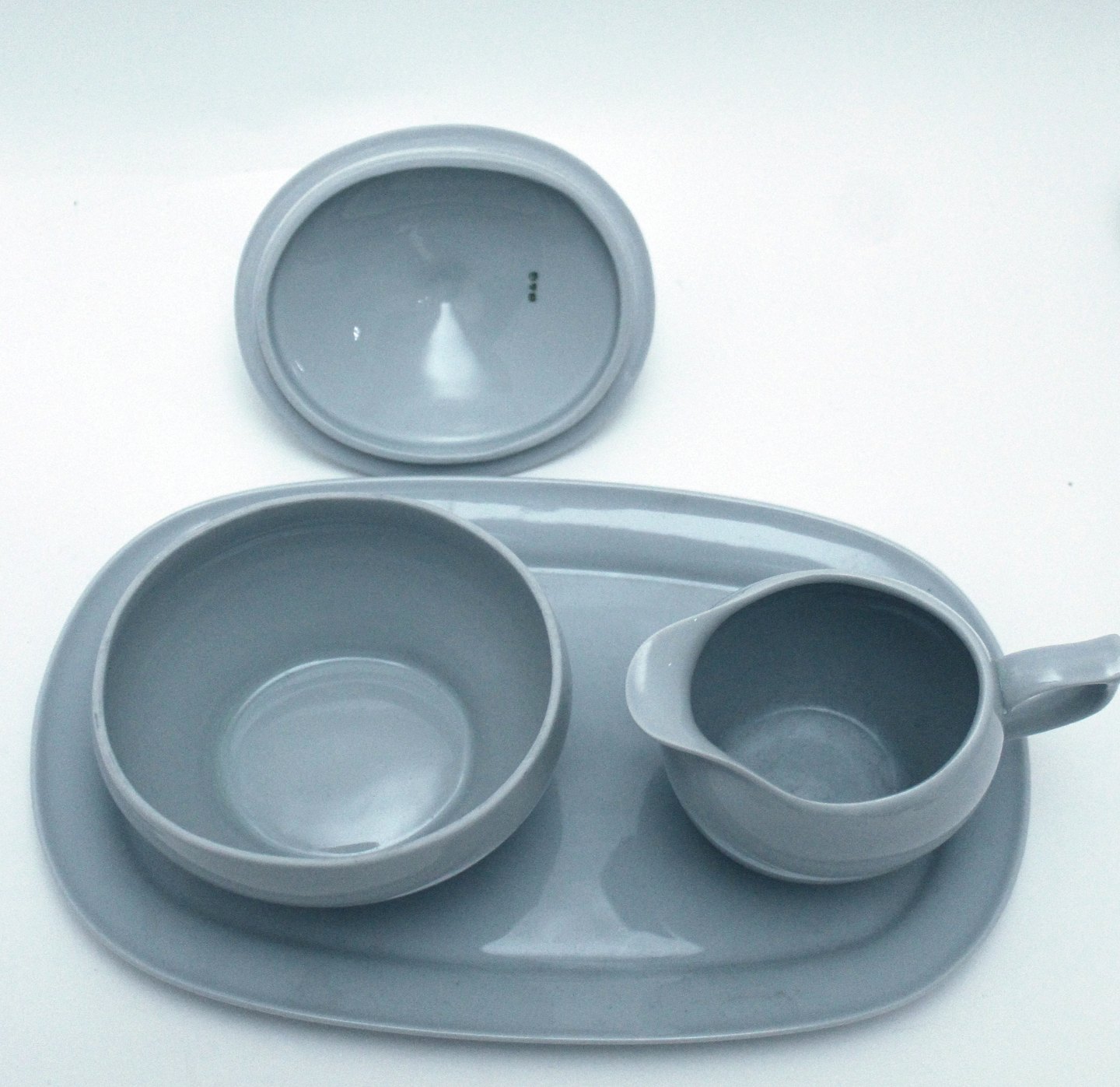 Bing & Grøndahl, Leda, Sart lysegrå/lyseblå stel. Sukker og flødesæt på bakke. Farven snyder meget, på billederne ser det lyseblåt ud og alt efter lyset ser det gråt ud.