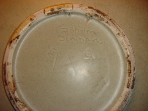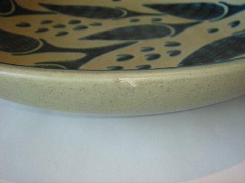 Søholm fad "Lupin" fra 1960 af Einar Johansen, Bundfarve blå-grå med mørkeblå abstrakte blomster.Diameter 32 cm. højde 6 cm. Fadet har en lille brændingsskade i kanten, se billede.