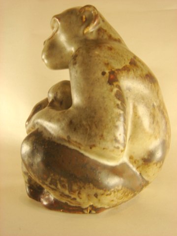 Stentøj. Peder Hald. Signeret HALD inde i figuren. Abemor med unge. Brændingsrevner forneden. Højde 18 cm. solgt.