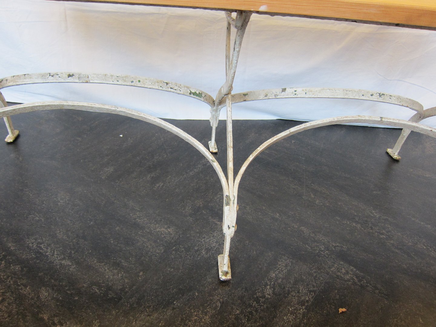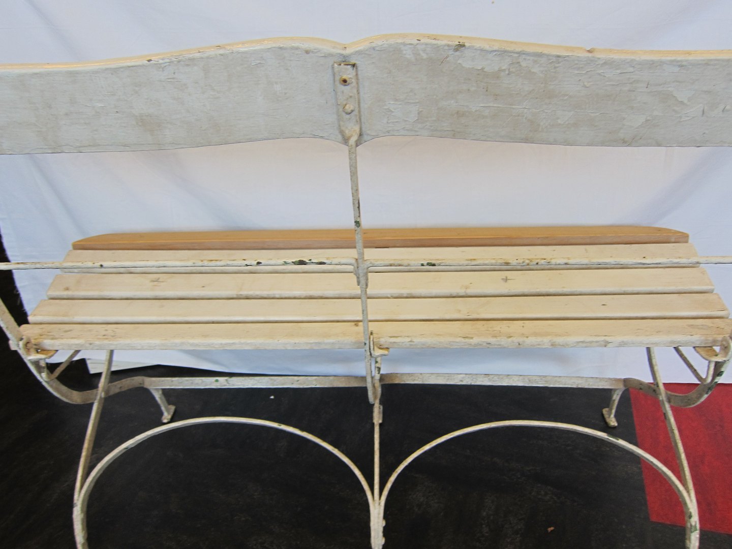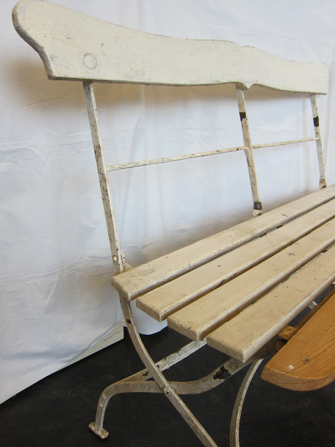 Bænken er gamle og restaureret med et enkelt nyt træstykke, som er af samme alder som det oprindelige træ Restaureringen af træet er valgt fordi stolenes jern er i god stand (se foto)