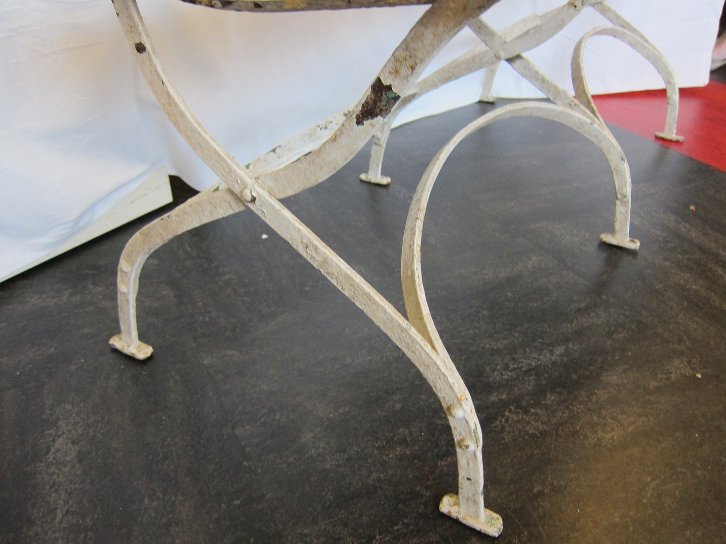 Bænken er gamle og restaureret med et enkelt nyt træstykke, som er af samme alder som det oprindelige træ. Restaureringen af træet er valgt, fordi stolenes jern er i god stand (se foto).