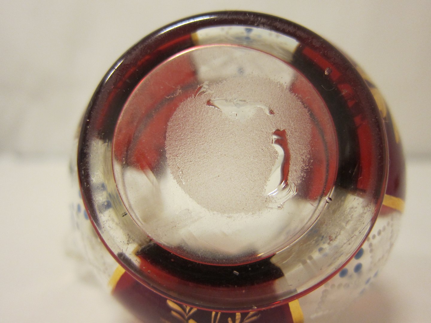A red-and-white antique cream jug made of glass with a beautiful enamel painting as decoration