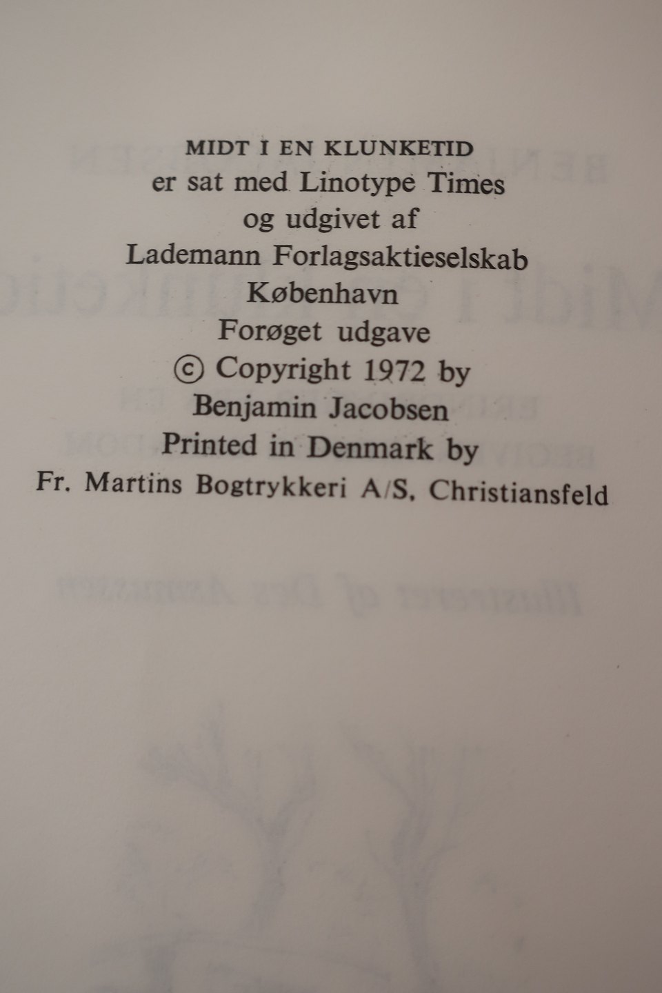 Midt i en klunketid Erindringer fra en begivenhedsrig barndom Af Benjamin Jacobsen Illustreret af Jes Asmussen Udgivet af Lademann Forlagsaktieselskab 1972 Hard Back Sideantal 214 God stand Varenr.: R2H4-4-61281