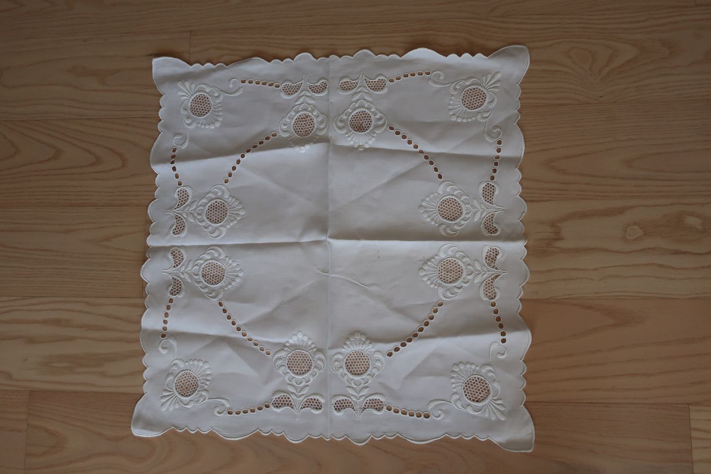 Gammel dug Håndbroderet med hvidt broderi Ca. 55cm x 55cm God stand, men bør vaskes Varenr.: DG92-4-410181