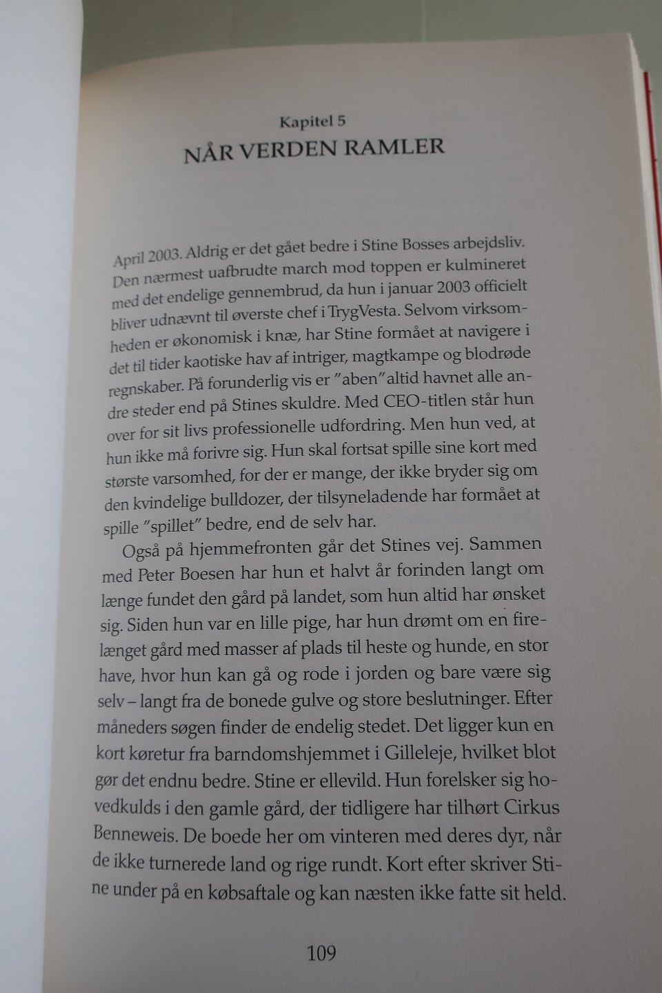 En beretning om den højst placerede kvindelige topchef i Danmark. Hun er flere år i træk udpeget til at være blandt de 10-15 mest magtfulde kvinder i Europa af Financial Times. I bogen åbner hun op og fortæller for første gang sin personlige historie inkl. viljen, som har bragt hende så langt.