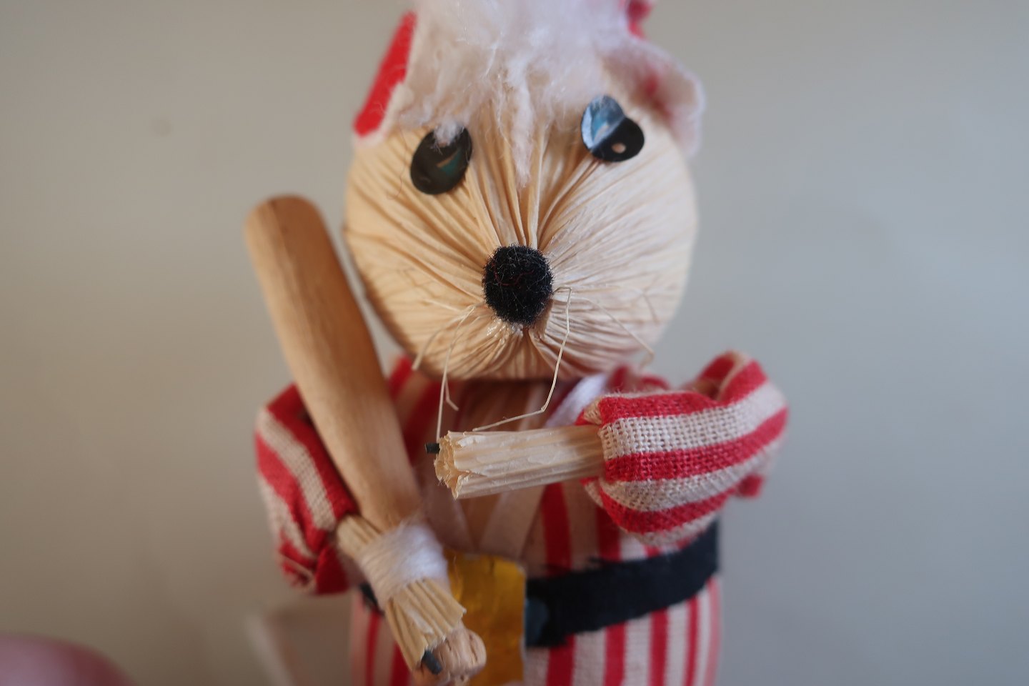 A very cosy christmouse made of fabric and straw H: about ca. 12cm From the 1960-years In a very good condition Articleno.: KL1005