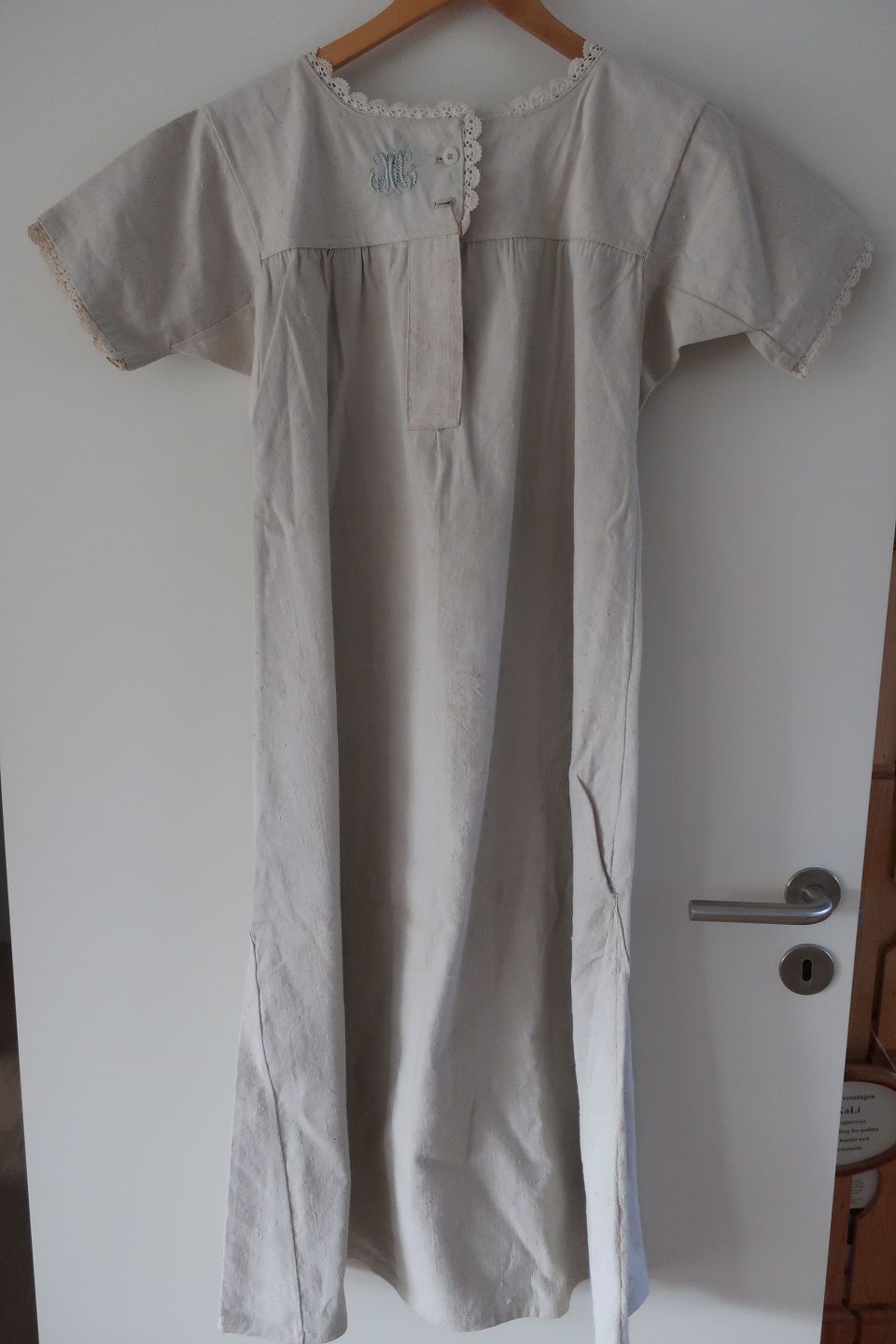 An antique shift with hand made buttonholes, embroidered hand-made initials and other items to make the dress beautiful